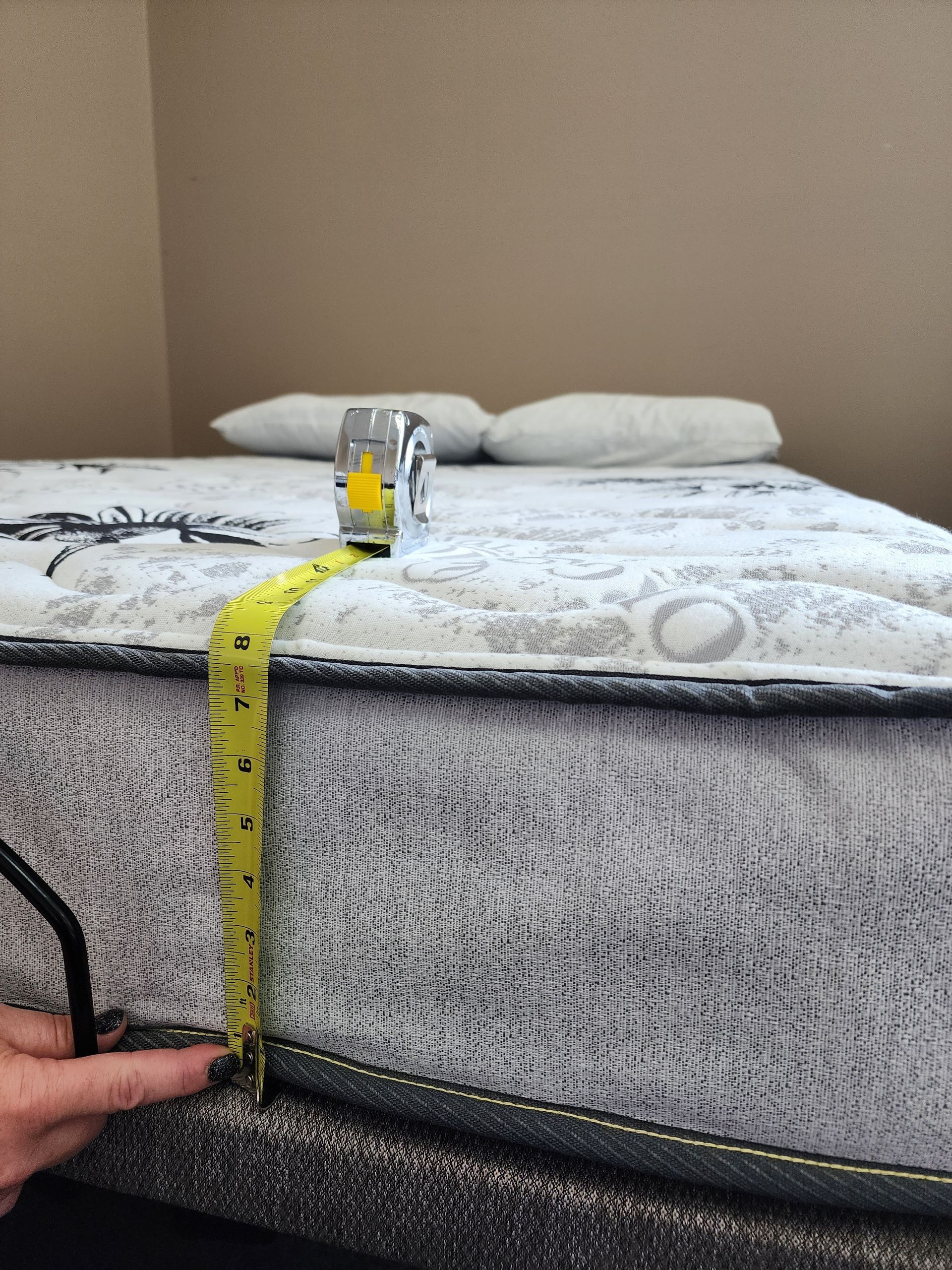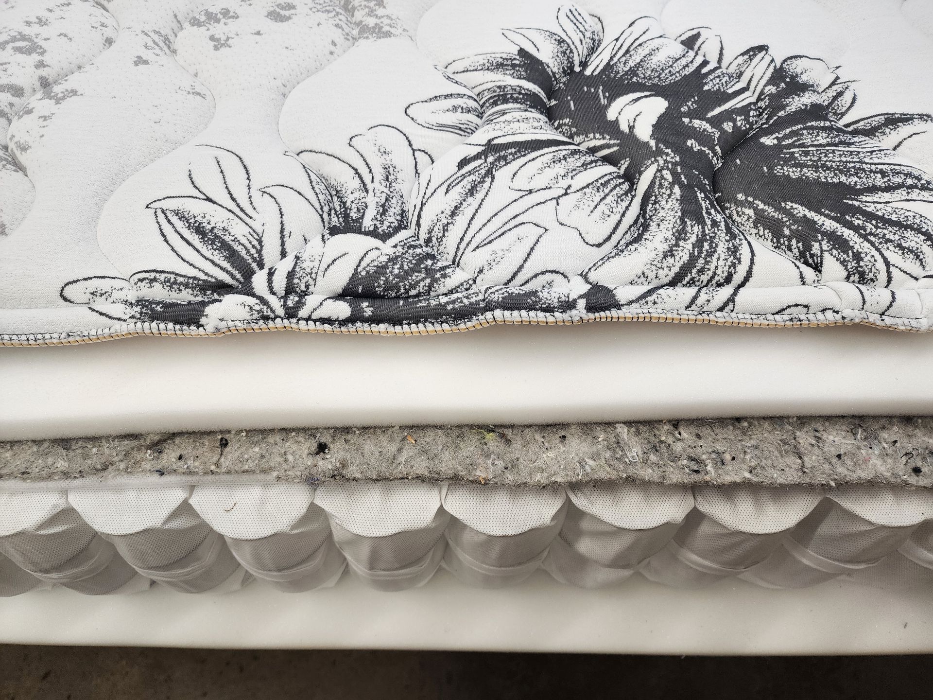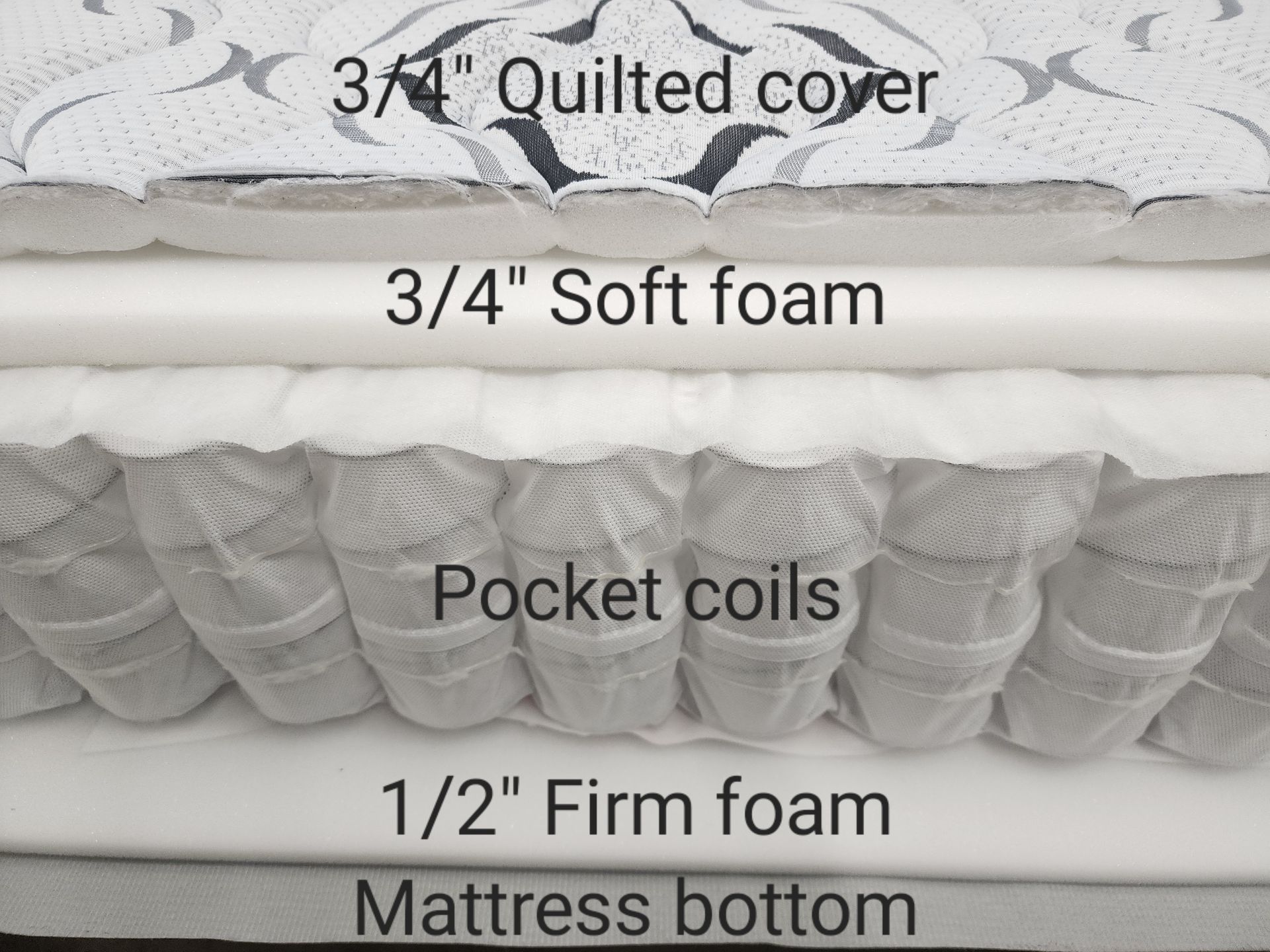 We put a 1/2" firm foam on the bottom of the mattress to provide structure, the pocket coil, a 1/4" insulator pad followed by the 3/4" soft foam and a 3/4" quilted cover. This mattress finishes at about 8" thick and is ideal for back and stomach sleepers.